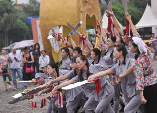 第一絕:打饃 春發(fā)生葫蘆頭的餅大有講究,色澤必須金黃色,質(zhì)地必須柔、韌、筋,形態(tài)更是講究“虎背鐵圈菊花心”,“虎背”是形容餅色澤的金黃,“鐵圈”是指由于餅型的圓度而形成的深褐色邊沿,“菊花心”則是指經(jīng)過(guò)多次揉制才可能形成的餅心的形態(tài),只有這樣的餅才算合格。