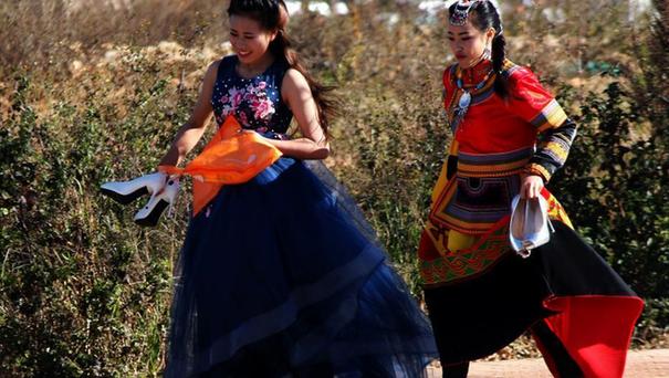1月9日,云南藝術學院兩位光著腳奔向考場的考生。2017年云南省藝術類專業統考于1月7日至12日分別在云南藝術學院、云南師范大學、昆明學院舉行。