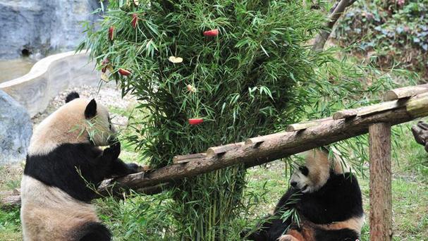 云南動物園大熊貓?zhí)崆跋碛谩笆フQ大餐”