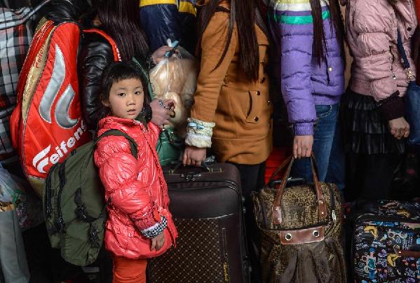 1月27日,一名小女孩跟著大人排隊,準備乘坐杭州開往貴陽方向的火車。