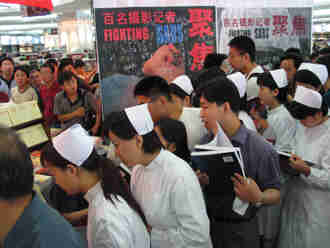 Beijing's nurses and residents queue up for copies of a new pictorial collection entitled "Fighting SARS", Sunday, June 29, 2003, which was made available Sunday. The photo album includes a collection of 200 special photos by some 100 Chinese and foreign press-photographers to chronicle China's efforts against SARS.[newsphoto.com.cn]