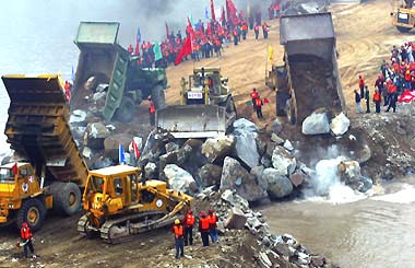 A file photo, taken November 6,2002, shows construction site when the upper cofferdam was successfully closed. [newsphoto.com.cn]