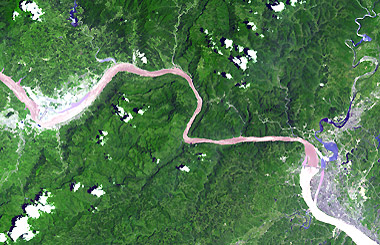 A NASA photo taken from US satellite illustrates a detailed position of Gezhouba Project and the Three Gorges Project. The brown belt crossing the picture is the Yangtze River, which flows from right to left. The on-construction Three Gorges Project is the white area on the left, while the Gezhouba Project on the lower right. The gray area is part of the Yichang city.