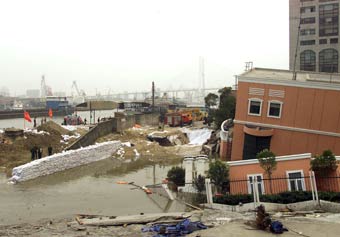A pump station inside Shanghai's anti-flood wall that had been withstanding high waters on the Huangpu River finally subsides under pressure yesterday, following the break of a dyke below the wall. The collapse was caused by work on nearby cross-river rail tunnels on Tuesday. More than 500 armed police have been busy dealing with the emergency. [newsphoto.com.cn]