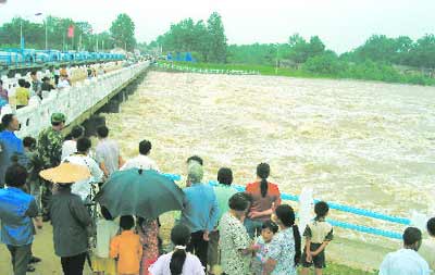 Water levels in the middle and upper reaches of the Huaihe River are in the danger zone at most check stations due to continuous heavy rain, despite flood diversion effort. "The task of flood control is too demanding and challenging for us this year,'' an anonymous official with the Huaihe River Flood Control Headquarters said. To reduce flooding in the main channel of the river, the headquarters yesterday started to divert water into another river. The move follows Wednesday's opening of sluice gates at the Wangjiaba dam, at the juncture of the river's middle and upper reaches. The Huaihong diversion river, which links the city of Huaiyuan and Hongzehu Lake on the river's lower reaches, can handle a maximum flow of 2,000 cubic metres per second. Water was flowing at 7,000 cubic metres per second in the Huaihe River at Huaiyuan yesterday. More torrential rain is expected in the Huaihe River Valley, with downpours and hailstorms forecast in Henan and Anhui provinces. The opening of the sluice gates on Wednesday forced the evacuation of more than 1,400 people in danger zones in the four flood diversion areas in Anhui Province. More than 100,000 people live in the 13,000 hectares of diversion areas, but most are safe because they live on higher ground. Though the opening of sluice gates at the Wangjiaba dam has eased water levels in the Huaihe River, they are still above the safety line because of continuous rainfall in the river's upper reaches. Wang Shucheng, Minister of Water Resources, recently said the country's flood control focus will switch to the Huaihe River from the Yangtze and Yellow rivers this year because the latter two are well contained by embankments. About 800 years ago, as the Yellow River deviated from its original course and began to flow through the lower reaches of the Huaihe River, it forced the Huaihe River to flow into Hongze Lake. As a result, the Huaihe River experienced frequent blockages and became highly prone to flooding. On June 28, the Huaihe River started flowing directly into the Yellow sea through a 163.5 kilometre-long manmade waterway. Wang said the project is key to prevent floods on a scale seen every 100 years in the lower reaches of Huaihe River. But the embankments along the river's upper and middle reaches still need to be reinforced. Over the past 10 or more years, the Chinese Government has earmarked more than 23.5 billion yuan (US$2.83 billion) for 18 key flood control projects along the Huaihe River.