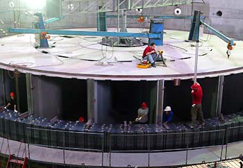 Workers fix the Unit I of the Three Gorges Project first batch of generators, June 30, 2003. Scheduled to put into optional on August 20, the Unit I is to follow the Unit II, which has undergone a 72-hour test run. [newsphoto.com.cn]