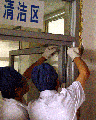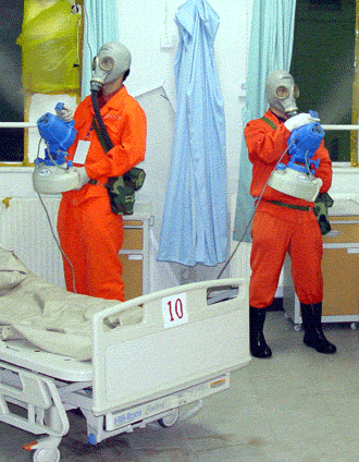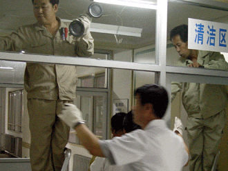 Two workers disinfect a ward at the Sino-Japanese Friendship Hospital in Beijing July 15, 2003. A SARS-designated hospital during the outbreak period, it was ready to receive ordinary patients July 20 after no new SARS (severe acute respiratory syndrome)cases were reported in the country for three weeks. [newsphoto.com.cn]