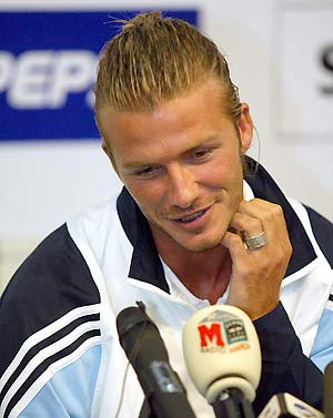 | Real Madrid midfielder David Beckham speaks at a press conference held in Kunming, Southwest China's Yunnang Province, July 30, 2003. Beckham said his Real Madrid transfer from Man Unite was not for money but the football and career challenges. Real Madrid is on a two-week Asian tour in cluding China, Japan, and Thailand. [sport.tom.com] |