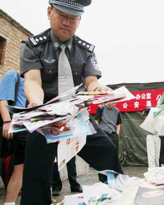 A police officer displays confiscated pirated or pornographic books before a public destruction ceremony July 29 in Beijing's Shunyi District. Beijing police have confiscated some 300,000 pirated or pornographic books from street sellers since early this year. [newsphoto.com.cn]