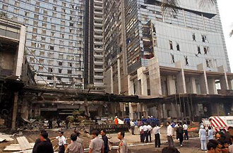 | Police officers and rescue workers gather outside the damaged J.W.Marriott Hotel in downtown Jakarta, Indonesia, on Tuesday, Aug. 5, 2003. A powerful bomb outside the hotel in central Jakarta killed at least 10 people and wounded 103, authorities said. And an official said it was likely a suicide attack. [AP] |