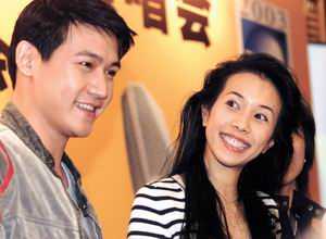 Pop stars Karen Mok of Hong Kong (right) and Chinese mainland's Lu Yi pose at a news briefing to promote the upcoing 2003 Asia Anti-Piracy Concert, in which top singers from South Korea, Japan and China will perform at the Shanghai Stadium on November 15. [eastday.com]