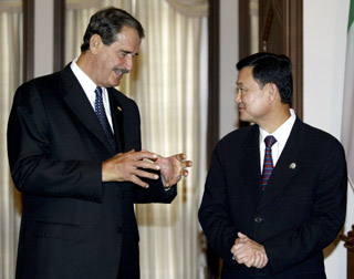 Mexican President Vicente Fox (L) chats with Thai Prime Minister Thaksin Shinawatra after their bilateral meeting in Bangkok October 19, 2003. Leaders of 21-member economies of the Asia-Pacific Economic Cooperation (APEC) are gathering in the capital of Thailand to attend the annual APEC summit.[Reuters]