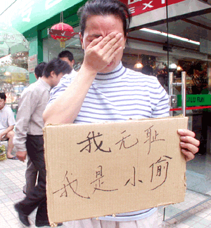 The head of security said the woman was willing to be punished as she was more afraid of being sent to the police. According to a lawyer, however, the supermarket has no right to punish the shoplifter privately. In addition, public humiliation of the thief might constitute a violation of the law, the lawyer said. Lu Wenjie manager with Shirble Department Store We have just detected nine potential shoplifters this morning (Friday) and drove them away. They are apparently a gang. Shoplifting is a great headache for our retail business. We cannot be so radical as to adopt this form of punishment. What we do is to place loss prevention agents inside the store. The monitoring system does not work well as most shoplifters are already aware of the cameras. When the thieves are caught, normally we'll fine them and try civil recovery. For first offenders, sometimes we call their parents, friends or relatives to come and educate them. It is incredible that many normal people shoplift. Once my public servant friend was caught for pocketing a shaver worth about 50 yuan (US$6). The guy wears a Rolex and cannot be poor. This kind of person should be sent to a psychologist. Prosecution is not an efficient deterrent as shoplifters are not severely punished by the law. It was reported that the loss incurred accounted for as high as five percent in the total revenue of some retail business. Mrs. Yang shopkeeper Did you see the picture we took of a shoplifter last time. I put it in my drawer so that our people will recognize him if he dares to show up again. He was found stealing two cartons of cigarettes valued at more than 500 yuan. A small shop like mine has a very narrow profit margin. If he had succeeded, it would have been a great loss to me. I don't think there is anything wrong with having the woman wear the sign. She deserves it. If she really cared about self-esteem, why did she steal in the first place. The last time I found two women trying to steal ginseng tea from my store I scolded them harshly. You know what I really wanted to do. I wish I could have stripped their clothes off. We did send a shoplifter to the police station but they just freed him after asking some questions. So why bother. We have our own way to deal with the issue. We'll scold or even beat the shoplifter until he promises not to do it again. Douglas Symss manager, Tando Indian restaurant I think shoplifters and pocket-pickers as well shall be sent to a kind of boarding school where they can be taught to be law-abiding citizens. These shameless thieves should have their brains washed to learn the ABC of respecting working people. They should also do some labor such as painting, sewing and cleaning. They must be trained to make a living through hard work and learn to respect others. If shoplifters are caught twice or more, the shopkeepers should sue them. They should be sent to jail depending on how serious the crime is. May Liu project manager, a finance company It does not seem proper to punish the woman with public humiliation. The woman might be poor, judging by what she had stolen. I think the retailer should handle the issue separately if the shoplifter is a first offender. In this case, the retailer should warn her and ask her to write a statement promising not to shoplift again in the shop. If the woman was a frequent offender, they could send her to the police. After all, shopkeepers have no right to enforce the law.