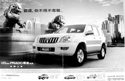 One advertisement depicts a traditional Chinese-style stone-carved lion saluting a moving Prado GX, whose Chinese translation means "despotic manner". "You have to pay respect to it," reads the slogan.