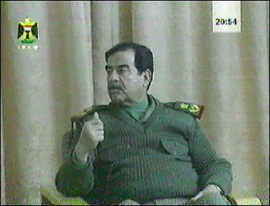 Former Iraqi President Saddam Hussein gesturing as he chairs a meeting with his ministers. Saddam Hussein has been captured in a raid by US forces backed by Kurdish fighters in his northern hometown of Tikrit. [Reuters]