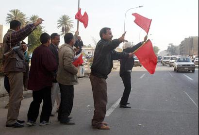 Iraqis wave flags in the streets of Baghdad after learing the news that former Iraqi president SAddam Hussein had been captured alive by American forces near his hometown of Tikrit Sunday Dec. 14 , 2003. [AP]