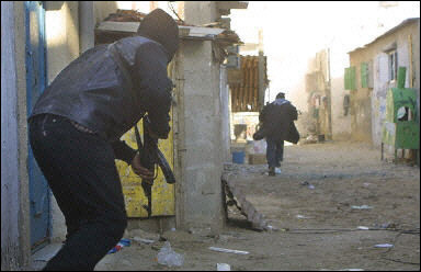 Palestinian gunmen take positions during an Israeli army operation in Rafah Tuesday. Eight Palestinians were killed during an Israeli army raid in southern Gaza, hours after two Israeli officers died in a grenade attack. [AFP]