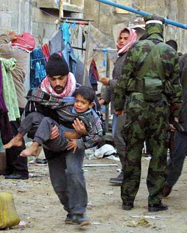 Palestinians evacuate kids during an Israeli army operation inside the Rafah refugee camp in the Gaza Strip, December 23, 2003. Israeli troops and tanks swept into a Gaza refugee camp Tuesday, killing eight Palestinians just hours after Israel lost its first two soldiers in a month of relative calm that has spurred peace efforts. [AFP]