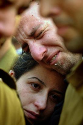 Israeli soldiers cry during the funeral of 23-year-old Israeli army Lt. Alex Leonardo Wiseman in the city of Afula, Northern Israel Tuesday Dec. 23 2003. Wiseman and another Israeli officer were killed late Monday in an ambush by Palestinian gunmen near a Jewish settlement in the Gaza Strip. [AP]