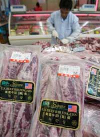 Imported U.S. beef is displayed at a supermarket in Inchon, west of Seoul, Dec. 24, 2003. Japan and South Korea, the two top buyers of U.S. beef, suspended imports Wednesday after the United States reported its first case of the deadly mad cow disease, triggering fears humans could become infected.  [Reuters]