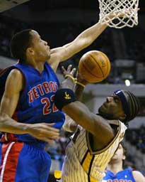 Indiana Pacers forward Jermaine O'Neal, right, is fouled by Detroit Poistons forward Tayshaun Prince as he shoots in the third quarter in Indianapolis Tuesday, Jan. 20, 2004. [AP]