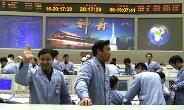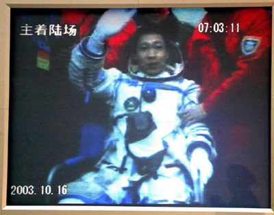 | | |  | | | China's first astronaut Yang Liwei waves to astronaut at the Hong Kong Stadium November 1, 2003. [newsphoto] | | | | | | | | | | | | |  | | | HK people crowd the the Hong Kong Stadium November 1, 2003 to get a glimpse of Yang Liwei, China's first astronaut. | | | | | | | | | | | | |  | | | Premier Wen Jiabao and other Chinese leaders applaud the success of China's first manned spaceflight.[Xinhua] | | | | | | | | | | | | |  | | | Yang displays China's national flag and the flag of the United Nations in outer space. | | | | | | | | | | | | |  | | | China's first manned spaceship - Shenzhou V (Divine Vessel V) blasts off into space at the Jiu Quan Satellite Launch Center in Northwest China's Gansu Province at 9:00am Wednesday morning October 15, 2003. The control center described the launch as a success. [Xinhua] | | | | | | | | | | | | |  | | | Yang Liwei, China's first space man, waves to the recovery teams after walking out of the return capsule of the Shenzhou V spaceship Thursday morning, October 16. | | | | | | | | | | | | |  | | | The control center for the Shenzhou V spaceship. | | | | | | | | | | | | |  | | | Yang Liwei is ready for mission. | | | | | | | | | | | | |  | | | Yang Liwei in training | | | | | | | | | | | | |  | | | Yang Liwei, his wife and his son | | | | | | | | | | | | |  | | | Yang Liwei, China's first space man, waves to the recovery teams after walking out of the return capsule of the Shenzhou V spaceship Thursday morning, October 16. [Xinhua] | | | | | | | | | | | | |  | | | photoelectricity telescope operators get ready for the launch of Shenzhou II January 10, 2001 | | | | | | | | | | | | |  | | | apartment for the astronauts | | | | | | | | | | | | |  | | | Spaceflight Memorial Tower of the Jiuquan Launch Center | | | | | | | | | | | | |  | | | rocket launching tower in Jiuquan | | | | | | | | | | | | |  | | | Spaceflight Memorial Tower of the Jiuquan Launch Center | | | | | | | | | | | | |  | | | A simulated astronaut is shown inside the landing capsule of the 'Shenzhou IV' spacecraft after it landed in Inner Mongolia, in north China, in this Jan. 5, 2003 photo. After 11 years of planning, China is on the brink of joining the elite of spacefaring nations.[AP]