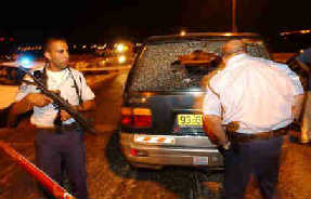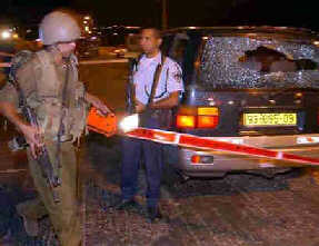 Israeli police and soldiers tape off a car where a seven-year-old Israeli girl was killed and her sister and grandfather were wounded in a shooting attack near the Kibbutz Eyal interchange, central Israel, close to the West Bank, late June 17, 2003. [Reuters]