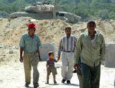 Palestinians walk past a Israeli tank positioned near Erez Crossing cutting off the Palestinian town of Beit Hanoun from the rest of Gaza Sunday, June 22, 2003. The checkpoints have caused great hardship in the past 33 months. Palestinian motorists are often unable to get from one end of Gaza to the other, meaning they can't reach schools and jobs. [AP]
