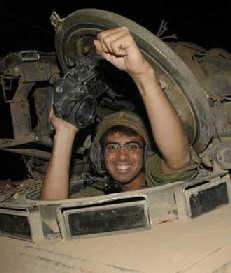 An Israeli soldier, peeking out of his armoured personnel carrier, smiles after leaving the northern Gaza Strip town of Beit Hanoun near the Nahal Oz crossing that separates Israel from the Gaza Strip late Sunday June 29, 2003. [AP]