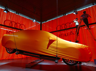 | Chinese workers clean a showroom with a covered, newly revamped model of Audi's luxury A8 before its opening to the public in Beijing July 13, 2003. Audi, the luxury unit of Volkswagen AG, said this week it aimed to sell more than 50,000 cars in its main growth market of China in 2003 after first-half sales rose 84 percent annually to 29,217 cars. [Reuters] |