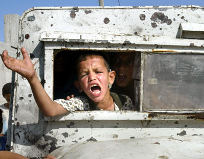 | A Palestinian boy chants anti-Israel slogans from inside a damaged car after the car was hit by missiles fired from Israeli helicopters in Gaza Strip August 30, 2003. Israeli helicopter gunship fired several missiles at a Palestinian car driving through a refugee camp in the central Gaza Strip on Saturday, killing two Hamas militants, Palestinian security officials said. [Reuters] |
