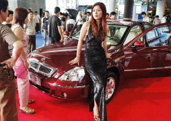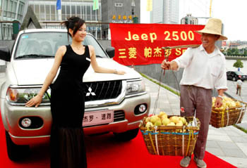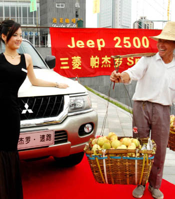 Hello, Babe. A farmer shouldering two baskets of peaches talks with a car model on June 27, 2003 , at the Ningbo Press and Culture Plaza, where a four-day auto show has been held. Ningbo, a coastal city in east China's Zhejiang Province, has very much developed in economy, where quite a number of farmers in the city have become owners of luxury foreign-brand cars. [newsphoto.com.cn]