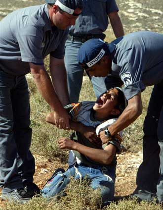 | Israeli policemen try to move a Jewish settler attempting to prevent troops from demolishig settlement outpost near the Jewish settlment of Svot Rachal near the Palestinian West Bank town of Ramallah June 26, 2003. The illegal outpost, consisting of several mobile homes and tents, is likely to be demolished by the Israeli army under the terms of the U.S-backed 'road map' plan for peace which calls for Israel to dismantle all illegal outposts it established since March 2000. [Reuters] |