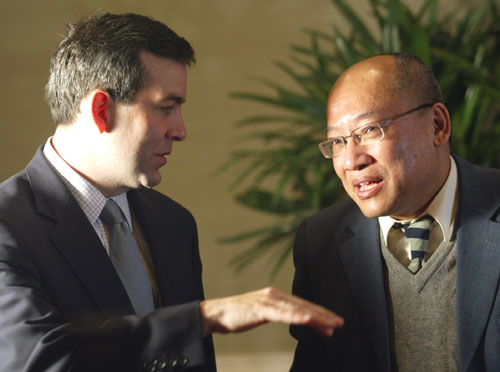 Updated: 2008-01-09 21:10 ![]() US Assistant Secretary of Commerce David Bohigian (left) and senior consultant of China Daily Zhang Xiaogang talk during a break in the China Daily Website web chat program in Beijing, January 9, 2008. Bohigian led the US Clean-Energy Trade Mission for a visit in China on January 8-13, had his first try at chatting with Chinese netizens. In his interview with Zhang, he talks at length about the prospects of clean energy technology cooperation between the two countries. [China Daily] |