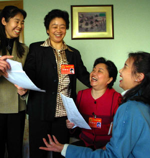 Women deputies to the National People's Congress from Shandong Province of East China spent International Women's Day Monday discussing constitutional changes and other topics at their hotel. The current 10th National People's Congress has 604 female deputies, accounting for 20.24 percent of the total 2,985 representatives. [newsphoto] |