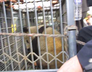 An astray giant panda is caught in a village in northen Sichuan Province's Jiangyou City on March 11 and sent to the reserve for giant pandas in the province. It is unknown how and why the panda appear in the area. The grown panda weighs about 60-70 kilograms. Sichuan is the home to most of giant pandas in China. [newsphoto]