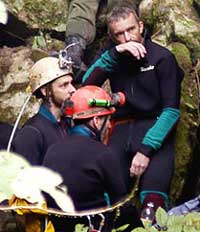 The cavers are camped on a 15-feet (5 metres) ledge above a fast-flowing underground river and have enough food to last until the weekend. Divers have to swim and walk through a series of caves to reach the trapped men. The cavers are not in imminent danger and are using a camping stove to cook pasta with cheese and instant chocolate cake, and have plenty of light and dry clothing, said expedition leader Maj. Steve Whitlock. They use the river for their hygienic needs, he said. |