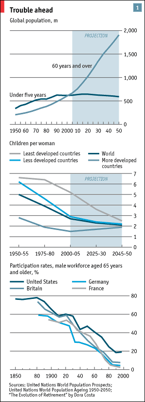 The rise in the proportion of the world's old will be the century's defining demographic trend. In some countries it may also determine the nature of politics, rates of economic growth (ageing countries will have slower rates of growth per head than those with younger populations) and global clout. In fact, three trends are running in parallel, each at a different pace. The first is a bulge in retirement, which will become noticeable in just over a decade. In many countries, especially in America, the birth rate rose sharply for some years after the end of the second world war. The older members of the American baby-boom generation are due to turn 62 (the minimum age at which Social Security allows early retirement) in 2008. The last baby-boomers retire in the late 2020s. But the generation, like a pig in a python, will guarantee an unusually large proportion of old folk—and then of very old folk—in the populations of most rich countries in this century's middle years. Its impact will be aggravated by a second trend: the widespread fall in fertility rates. In most countries women on average are not having enough babies to replace the people who die. Even in more fertile America, births only just equal deaths. In some countries, mainly in continental Europe and Japan, birth rates have been below replacement for a quarter of a century. When the baby-boomers retire, the size of the working population will plummet. That in itself is worrying enough. But there is a third problem: the old spend much more time in retirement than ever before. Life expectancy continues to rise, yet people are drawing their pensions earlier and earlier. A century ago most old people worked almost up to the end of their days. Now, by the age of 65, only 16% of men are still in the workforce in America and only 4% in continental Europe. Thus, a larger generation of old folk than ever before will need support for longer than ever before from a population of working age that is shrinking continuously in absolute size for the first time since the Black Death. And the level of that support is unprecedented. The triumph of Europe's welfare state and America's Social Security system has been more or less to eradicate poverty among the old. All rich countries—even America—now have health-insurance systems with near-universal coverage for the retired. The cost of these benefits, in effect, falls on those in work. This has prompted books with scary titles, such as “The Coming Generational Storm” by Laurence Kotlikoff, of Boston University, and Scott Burns, a journalist.
