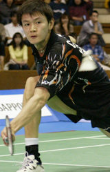 China's Bao Chunlai returns a shuttlecock during the Yonex Open Japan 2004 badminton championships men's singles final match against Ronald Susilo of Singapore in Tokyo April 11, 2004. Susilo defeated Bao 15-13 15-6. [Reuters]