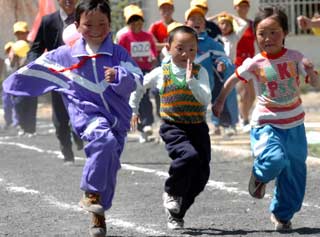 Three pupils dart to the finish line at a sport event organized by the Lhasa Special School May 9, 2004 in Lhasa, capital of the Tibet Autonomous Region. The special school for deaf, mute and other disabled children, was founded in 2002. [newsphoto] |
