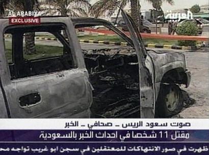 A burned out car seen in an image from television from the eastern Saudi Arabian city of Khobar on Saturday May 29 2004 after gunmen opened fire on compounds housing offices of oil companies. At least six people are reported killed including a 10-year old boy and three Westerners according to local sources. [AP]