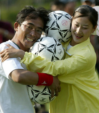 A North Korean woman hugs a South Korean man as they carry soccer balls during recreation time at an event marking the fourth anniversary of the summit between the two Koreas in Inchon, west of Seoul Tuesday. About 100 North Koreans attended the inter-Korean rally Tuesday to mark the anniversary of the June 15 Joint Declaration made by former South Korean President Kim Dae-jung and North Korean leader Kim Jong-il in Pyongyang four years ago. [Reuters]