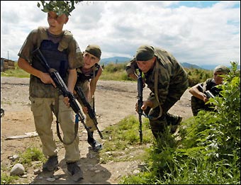 Russian soldiers conduct a search operation in the mountains of Chechnya . Armed clashes erupted overnight Tuesday near Russia's separatist republic of Chechnya as rebels stormed police targets in neighboring Ingushetia in brazen attacks that left dozens of people wounded and dead. [AFP]