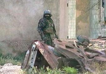 A TV frame grab shows a masked soldier as he stands in position during raids in the Dagestani capital Makhachkala, June 22, 2004. Special forces in Ingushetia's Federal Security Service (FSB) successfully stormed a building in Makhachkala that was taken over by Chechen militants on Monday night. [Reuters]