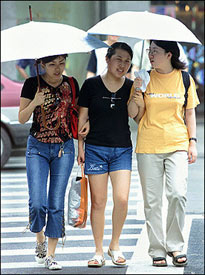Residents use umbrella as they cross a street in Shanghai during a heatwave. Meteorologists in Shanghai plan to seed clouds to try to create rain and cool scorching temperatures blamed for overloading the city's power generators. [AFP]