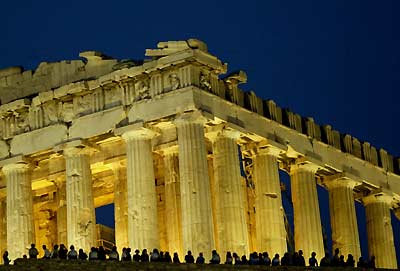 Officials and spectators wait for the Olympic flame to reach the 2,500-year-old Parthenon temple, where it will spend the night in Athens August 12, 2004. The flame will launch the Athens Olympics during the opening ceremony on August 13 after touring all five continents for the first time in Olympic history. [Reuters]