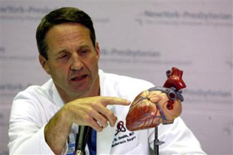 Dr. Craig R. Smith, chief of the Division of Cardiothoracic surgery at the New York-Presbyterian/Columbia University Medical Center uses a model of a human heart to explain to reporters the heart bypass surgery he performed on former U.S. President Bill Clinton, Monday, Sept. 6, 2004, in New York.[AP]