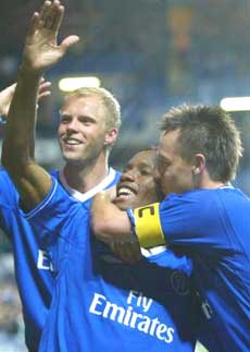 Goals by Alexei Smertin, Didier Drogba and John Terry gave Chelsea its second victory in a row and control of Group H. It left Porto third in the standings with just one point. Six-time champion AC Milan scored twice in the last two minutes to beat Celtic 3-1 and is tied with Barcelona atop Group F after the Spanish power beat Shakhtar Donetsk 3-0. German champion Werder Bremen came from behind to beat Valencia 2-1 after the Spanish champion saw Carlos Marchena ejected early in the second half. With Inter Milan winning 3-1 at Anderlecht to lead Group G, with a maximum six points, Bremen and Valencia are at three. Rosenborg, Norwegian champion 12 seasons in a row, tied 1-1 with Arsenal, which is atop Group E after Panathinaikos' 1-0 loss at PSV Eindhoven. At Stamford Bridge, Russian midfielder Aleksei Smertin gave Chelsea a seventh minute lead and Drogba, who scored twice against Paris Saint Germain two weeks ago, made it 2-0 five minutes into the second half. Substitute Benni McCarthy scored for Porto in the 66th for only the second goal Chelsea has conceded all season, but Terry dived to head home Frank Lampard's free kick four minutes later. CSKA Moscow won for the first time since the competition became known as the Champions League 11 years ago, beating PSG 2-0 at home. Its previous results were two ties and four losses. Deco, signed away from Porto in the summer, put Barcelona ahead in the 14th minute against Shakhtar Donetsk. Ronaldinho added the second goal with a penalty kick after he had been brought down by the Ukrainians' goalkeeper. Cameroon striker Samuel Eto'o scored the third near the end and Barcelona tops the group on goal difference. Swedish midfielder Fredrik Ljungberg gave English champion and Premier League leader Arsenal a sixth- minute lead when he shot home from close range. But the Norwegian champion tied it when Roar Strand connected from 20 yards in the 52nd minute. Despite dropping two points, Arsenal went on top of the group because Panathinaikos lost at Eindhoven where Jan Vennegoor deflected home a header by Alex 10 minutes from the end. Valencia couldn't recover from the loss of defender Marchena for his second yellow card in the 52nd minute. The Spanish champion was already a goal ahead thanks to a second-minute strike by Rodriguez Vicente. After Marchena's dismissal, however, Miroslav Klose tied it in the 60th