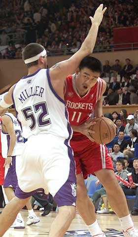 Chinese star Yao Ming had 13 points, 8 rebounds, 3 assists, one block but 5 turn-overs for the Rockets in a 27-minute showup before the passionate 17,900 fans of Beijing, the city where he spent more than six months a year before entering NBA in 2002.. The Rockets were 10 points up in the second quarter, but the Kings swiftly caught up. They pulled ahead in the third quarter, as Sacramento guard Mike Bibby intercepted a Houston pass and shoveled it to Kevin Martin for the slam dunk. ``They were just a lot quicker to the ball in the second half than we were,'' said Houston coach Jeff Van Gundy. ``Yao had five of our 22 turnovers, so turnovers were a problem for everybody.'' Houson's Juwan Howard was the game's top scorer with 15 points, Tracy McGrady, the NBA's two season top scorer, added 14 besides 4 boards and 4 assists. Chris Webber scored 12 points for Sacramento, including 10 out of 24 points
