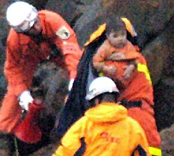 Orange-clad rescue workers toiled for hours to shift huge boulders that had crashed onto the family's white van to rescue two-year-old Yuta Minagawa, gently passing him from hand to hand before airlifting him by helicopter to hospital.